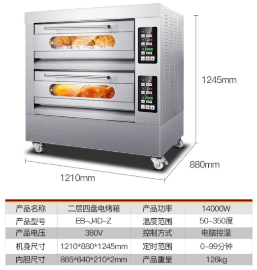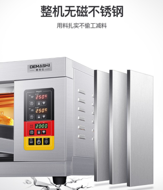 溫度范圍400度,烤箱的材質材質就是前面不銹鋼,后面烤漆板, 內部免漆板   ,保溫層9公分厚,帶6個記憶按紐,第一次設置好之后直接按記憶按鈕1、2、3、4、5、6,帶記憶、帶定時電腦版分層式電烤箱 紅外線電熱管??緺t擁有多種規(guī)格:1層2盤、2層4盤、3層6盤、3層9盤,供您選擇。電烤箱要根據(jù)您現(xiàn)在使用的額定電壓發(fā)貨的,兩相電是220V,三相電是380V。建議用6平方線!60A空氣開關!一般商用的電器都是沒有插頭,為了更好保護設備和安全需要用到空氣開關,自備電線跟水管的,我們提供接線視頻的!
